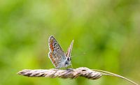 Macro foto van een bruin blauwtje vlinder met een wazige achtergrond.