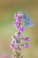 Dit vlindertje heet Hooibeestje. Dit exemplaar zat op de vroege ochtend te drogen op een takje van de bloeiende struikheide.