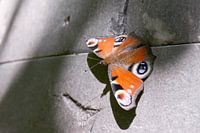 Close-up van een kleurige vlinder in oranje bruine tinten op grijs stenen muur.