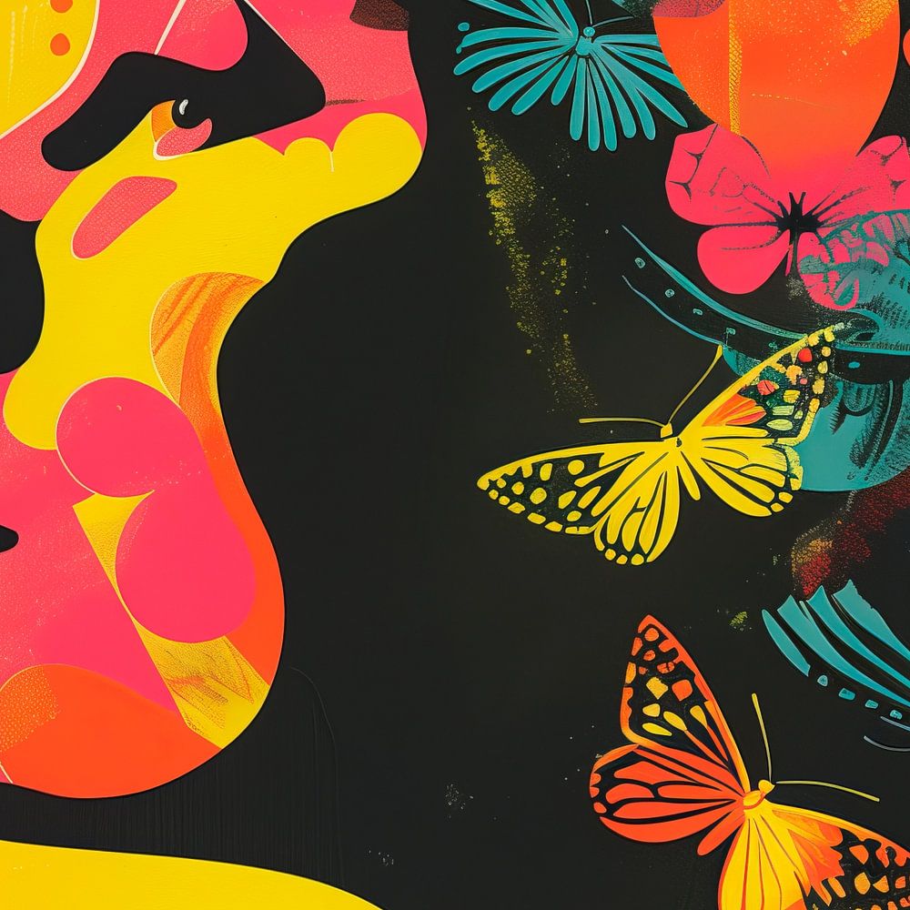 Digitaal werk met behulp van diverse programma's en filters van een vrouw met liefde voor vlinders in een kleurrijk abstracte vorm