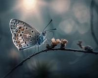 Deze vlinder op een gebogen takje met bloemknop, maakte ik met behulp van Ai. Het Icarus blauwtje zit in het late zonlicht met een mooie scherpte diepte. Dof en blur typeren deze achtergrond.