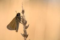 Een vlinder in het vroege ochtendlicht. Het is een zwartsprietdikkopje op een grasje.
