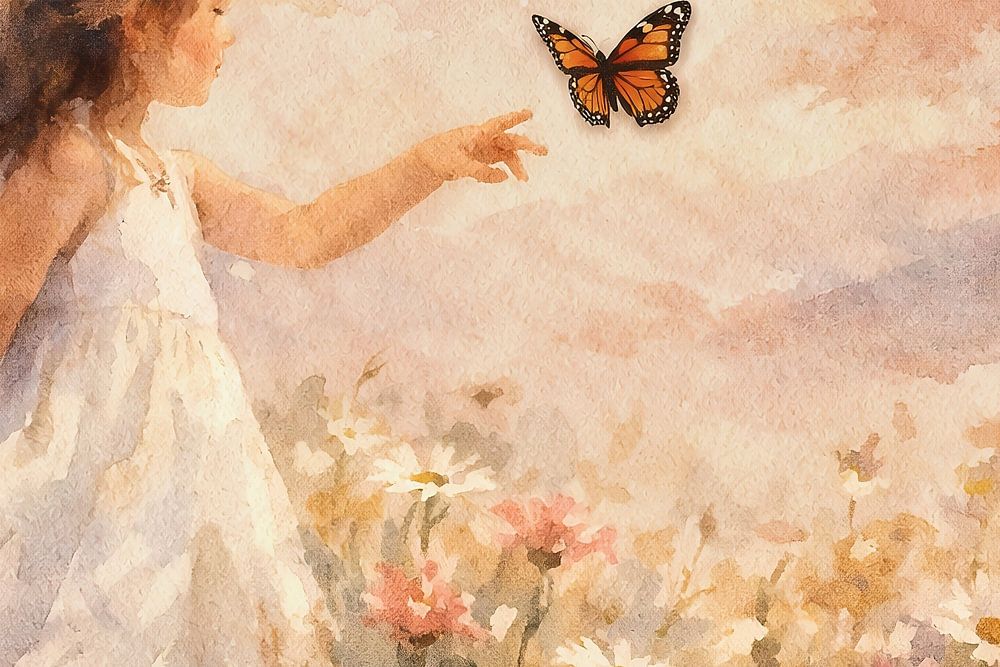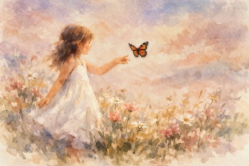 Een jong meisje met bruin haar, gekleed in een wit jurkje, staat in een bloemenveld en strekt haar hand uit naar een oranje vlinder die net boven haar vingers zweeft.