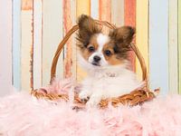 Cute papillon puppy in a wicker basket on a pink and pastel coloured wooden background
