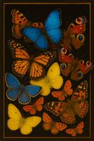 Een bonte verzameling vlinders in levendige tinten blauw, oranje, rood en geel danst tegen een diepe, donkere achtergrond. Dit kunstwerk vangt de fragiele schoonheid van de natuur in een harmonieus en elegant stilleven.