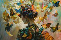 Vlinders | Butterfly Whisper - Dit vrouwen schilderij beeldt een vrouw uit met een profiel van vlinders die om haar heen en op haar verschijnen, waardoor een levendige en surrealistische compositie ontstaat.