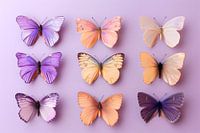 Dit lieflijke, trendy kunstwerk toont een zorgvuldig gerangschikte verzameling vlinders op een effen lavendelkleurige achtergrond.