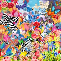 Vrolijke voorstelling van vlinders, bloemen en vogels. Dit schilderij is ook te bestellen als behang. Wie vrolijkheid en kleur in huis wil halen koopt dit mooie schilderij