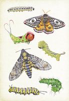 Een collage van vlinders en rupsen geïllustreerd door natuurillustrator Jasper de Ruiter. Op deze plaat staan de rupsen van groot koolwitje, hermelijnvlinder, doodskopvlinder, nachtpauwoog en monarchvlinder. De twee vlinders zijn de nachtpauwoog en doodskopvlinder.