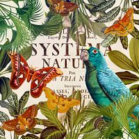 Exotische vlinders en een cyaankleurige papegaai tegen een achtergrond van gebladerde planten en een boekomslag.