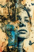 Op deze foto versmelt het gezicht van een vrouw met een dromerig landschap van stedelijke structuren en fladderende vlinders. De tere vleugels van de vlinders die om haar heen dansen contrasteren met de hoekige vormen van de gebouwen. Deze samensmelting creëert een speciale spanning die de kijker meeneemt naar een wereld tussen…