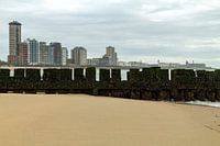 Vlissingen, Zeeland, Nederland. Zicht op de skyline van de boulevard gezien vanaf het strand met een golfbreker op de voorgrond.