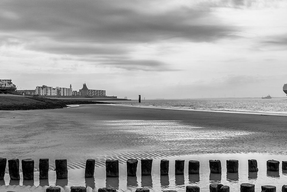 het strand bij Vlissingen met een deel van de Boulevard Evertsen. Op de Westerschelde passeert het autoschip "Precious Ace" waar de Loods vanuit de Pilotboot net aan boord is geklommen...