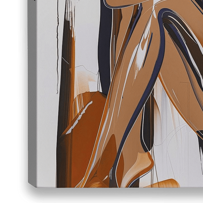Dit kunstwerk toont een vrouw in een zittende en introspectieve houding, weergegeven in een vloeiende en expressieve schilderstijl. De kleuren bestaan voornamelijk uit warme tinten zoals bruin, oranje en zwart, wat een gevoel van intimiteit en warmte oproept. De kunststijl is modern en abstraherend, waarbij de contouren van haar lichaam…