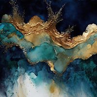 Een modern kunstwerk, een vloeibaar gegoten abstract hedendaags schilderij met een groenblauwe en gouden kleurstelling. Het schilderij heeft een marmerachtige textuur die ontstaat door de vloeibare verf met verschillende technieken te manipuleren, wat resulteert in een gemarmerd effect. De blauwgroene en gouden kleuren zijn in combinatie gebruikt om een opvallend contrast te creëren, waarbij de gouden verf over het doek loopt om diepte en textuur te creëren. Het totale effect is een modern en abstract stuk dat in elke kamer als blikvanger zal dienen.