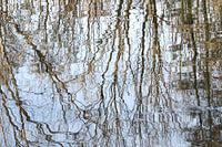 Abstract waterlandschap met reflecties van bomen in stromend water met ZEN-gevoel.