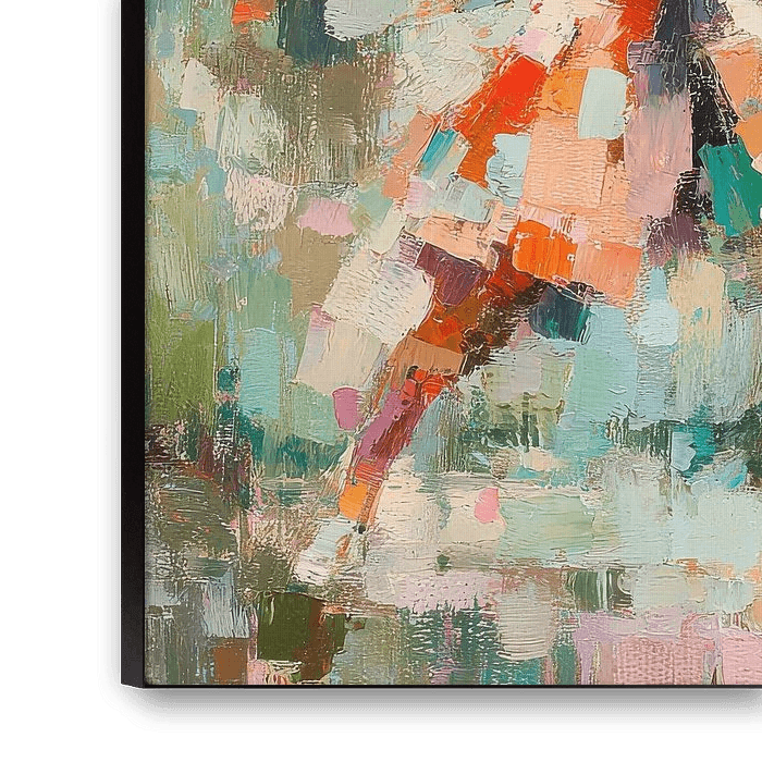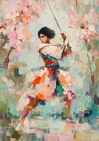 Een impressionistisch schilderij van een vrouwelijke samuraifiguur in een dynamische pose, iets links van het midden van de afbeelding. Ze houdt een verticaal zwaard in haar rechterhand en draagt een vloeiende jurk in pastelkleuren met oranje, rode en blauwe strepen. Haar donkere haar omlijst haar gezicht, dat naar de kijker gekeerd is. De achtergrond bestaat uit abstracte penseelstreken in roze, oranje en blauw, met roze bloemen die beweging en diepte creëren. De expressieve schilderstijl legt de nadruk op kleur, textuur en gebaar, en plaatst de figuur in het centrum van de compositie. De zachte pastelkleuren creëren een harmonieuze, dromerige sfeer.