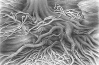 Over ‘Vloeiende structuren van boomwortels’ van Adriana Müller