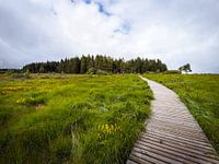 In het natuurpark Hoge Venen in de Belgische Ardennen zijn vele mooie wandelroutes. Dankzij de vele vlonderpaden is het mogelijk om door het hoogveen te lopen. Dit pad leidt naar een naaldbos.