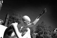 Pop op vlooienmarkt, etalagepop, tweedehands spullen, retro, vintage, oude stad, gevels, straatleven, straatfoto, straatfotografie, zwart-wit foto, zwart-wit fotografie, hoog contrast, horizontaal beeld, urban, jordaan, amsterdam, Rob Blok Photo