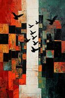 Vlucht door Contrast toont een krachtige dialoog tussen tegenpolen. Het beeld wordt gedomineerd door twee massieve kleurvelden: links vurige tinten van rood en oranje, rechts diepe groenen en donkere schakeringen. Tussen deze twee werelden opent zich een smalle, verticale baan van licht — een heldere doorgang die de compositie in tweeën…