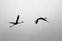 "Vlucht in Schaduw" is een prachtige zwart-wit compositie die de gracieuze vlucht van twee flamingo's in silhouet vastlegt tegen een serene, minimalistische achtergrond. De contrasterende vormen benadrukken de sierlijke beweging van hun lange vleugels en gestrekte lichamen, terwijl de leegte van de lucht een gevoel van rust en vrijheid oproept. Dit kunstwerk belichaamt de schoonheid van eenvoud en natuur, perfect voor een minimalistisch interieur of voor liefhebbers van fotografie en vogels. Het vangt een tijdloos moment van harmonie in de lucht.