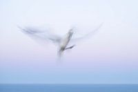 Een dromerige en minimalistische opname van een jan-van-gent in vlucht boven zee. Door de zachte bewegingsonscherpte krijgt het beeld een bijna schilderachtige uitstraling, waarbij lucht en water samensmelten in verfijnde pasteltinten. De subtiele overgangen van blauw en lichtgrijs creëren een serene, rustige sfeer.