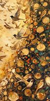 "Vlucht in de Gouden Schemering" toont een groep zwaluwen in een dynamische vlucht, tegen een achtergrond van gouden cirkels die de avondzon lijken te vangen. De levendige beweging van de zwaluwen, die elegantie en vrijheid uitstralen, contrasteert met de statische ronde vormen, wat een gevoel van evenwicht en harmonie brengt. De warme gouden en diepe groentinten zorgen voor een rijke textuur en een gevoel van diepte in het beeld. Dit beeld zou een gevoel van beweging en natuurlijke gratie toevoegen aan elke ruimte, een perfecte keuze voor diegenen die de energie van de natuurlijke wereld in huis willen halen.