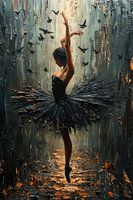 Dit indringende olieverfschilderij vangt de essentie van een eenzame ballerina, badend in een vleugje licht te midden van een kamer die in schaduwen is gehuld. De ballerina, centraal geplaatst, staat op één been, met haar andere been gestrekt en haar armen elegant boven haar hoofd gevouwen in een klassieke balletpositie. Haar tutu,…