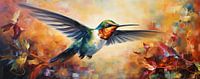 Vluchtige Beweging - Dit dynamische schilderij vangt de essentie van een kolibrie in volle vlucht, omgeven door een wervelwind van herfstbladeren. De impressionistische stijl brengt een levendig palet van warme oranje, geel en rood tonen, afgewisseld met koele blauwe accenten die diepte en contrast geven. Het kunstwerk straalt energie en beweging uit door de vloeiende penseelstreken en de fijne details in de veren van de vogel.