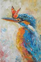 "Vluchtige Momenten" is een portret van een ijsvogel, vastgelegd in een kleurenspectrum dat zijn levendige persoonlijkheid weerspiegelt. De ijsvogel, bekend om zijn snelle duikvlucht in heldere wateren, staat hier als symbool voor het ongrijpbare moment van pure vrijheid. Het beeld lijkt wel een korte pauze in zijn dag: een rustpunt waarbij de vogel de wereld om zich heen observeert, misschien wel op zoek naar de volgende kans om toe te slaan terwijl een vluchtige vlinder op zijn snavel land.