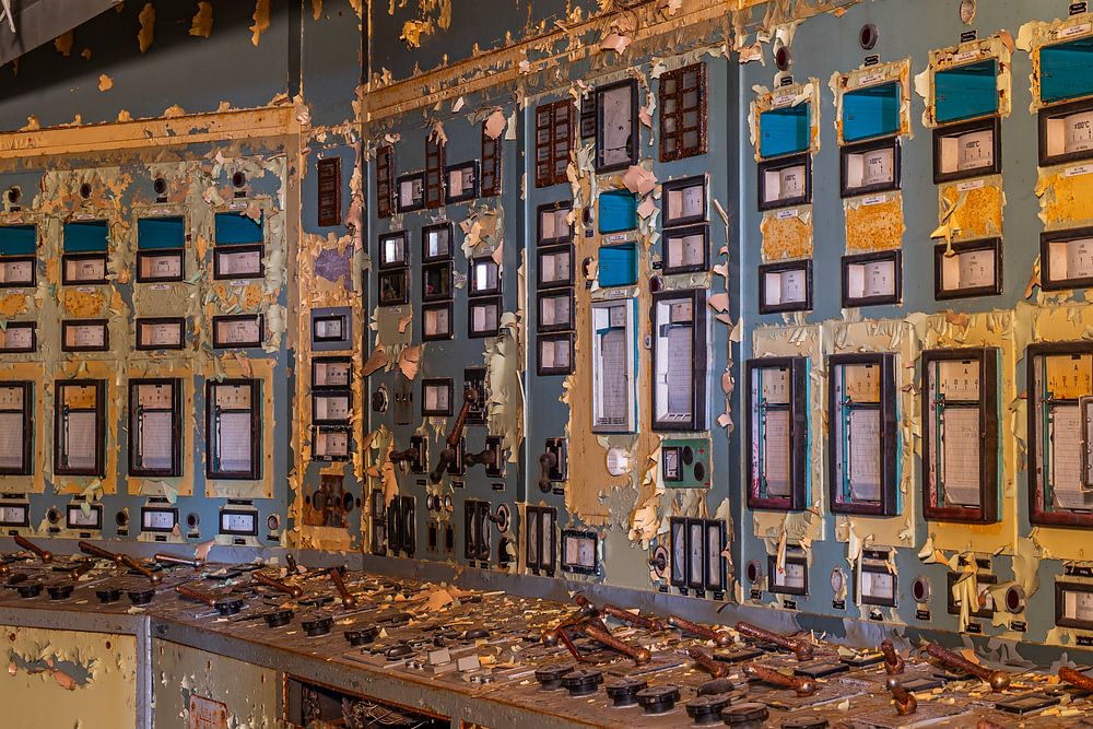 Deze foto vangt de essentie van industriële nostalgie in een van de oudere controlekamers van de voormalige Vockerode energiecentrale. De meters, die ooit vitale informatie doorgaven, staan nu stil en zijn omgeven door afbladderende verf, die in dikke lagen van de panelen puilt. Dit gedetailleerde beeld brengt de vergane glorie van deze technologisch complexe ruimte tot leven, terwijl het verval een verhaal vertelt van de onverbiddelijke kracht van de tijd. Perfect voor liefhebbers van industriële fotografie, urbex en de unieke schoonheid van verlaten plekken. Voeg deze krachtige herinnering aan een technisch tijdperk toe aan je interieur.