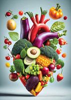 Een levendige en opvallende illustratie van een hart dat volledig bestaat uit vers fruit en groenten. Dit kleurrijke en creatieve ontwerp dient als een krachtige herinnering aan het belang van een gezond dieet voor een gezond hart.