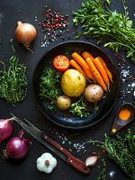 Deze foto toont een rustiek en levendig tafereel van voedselbereiding, met verse groenten en kruiden kunstig gerangschikt op een donker oppervlak. In het midden van de afbeelding staat een gietijzeren braadpan gevuld met verschillende ingrediënten zoals groenten, wortelen, aardappelen, kruiden, knoflook en uien.