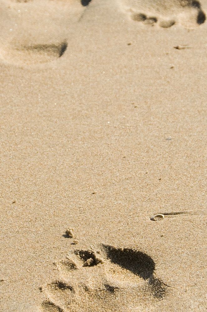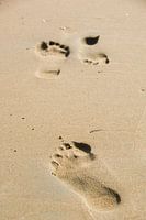 Voetafdrukken in het zand op het zeestrand ontmoeten