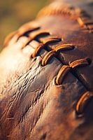 Een fascinerend detail van een versleten voetbal, waarvan de littekens en hechtingen verhalen van spannende wedstrijden. Het warme, aardse kleurenpalet straalt nostalgie en bewegingsdrang uit. Perfect voor de woonkamer om sportieve passie en herinneringen aan lange spelavonden op te roepen en een uitnodigende sfeer te creëren.