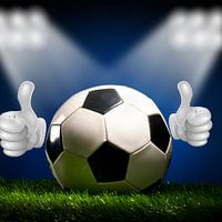 Voetbal op grasmat in voetbalstadion met de duimen omhoog.