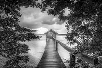 Steiger aan de Ammersee in het zuidwesten van München. Kleine steiger met boothuis omlijst door bomen in prachtige natuur aan het meer in Beieren.
