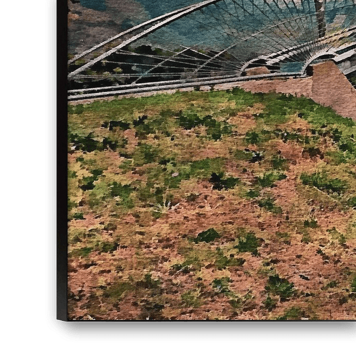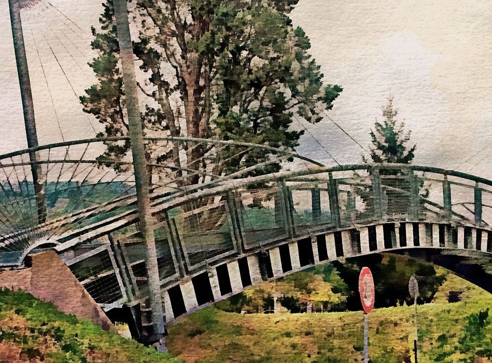 Deze prachtige tuibrug voor voetgangers overspant de Via Che Guevara in Tavernelle (Umbrië, Italië) en verbindt het gezondheidscentrum aan de ene kant met een kinderspeelplaats aan de andere kant. Vroeger liep er een spoorlijn door Tavernelle en wij denken dat deze brug een overblijfsel is uit die tijd.