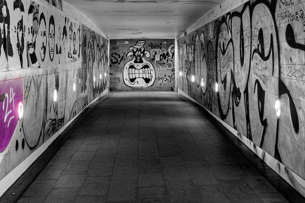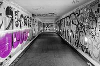 De met Graffiti en stickers gedecoreerde voetgangerstunnel tussen de wijk Schnoor en de Weserpromenade in de stad Bremen. Uitvoering in Zwart-wit met kleuraccent. Deze foto is gemaakt in December 2025