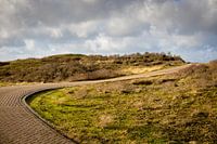 Een slingerend voetpad door een Nederlands duingebied, in de winter.