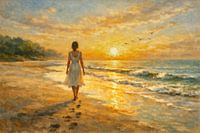 Op de voorgrond is een vrouw te zien, van achteren gefotografeerd, die in een wit jurkje langs de waterlijn loopt. Haar voetafdrukken zijn zichtbaar in het natte zand. De linkerkant van het schilderij wordt begrensd door…