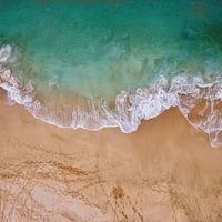 Voetstappen in het zand digitale gouache schilderij van strand met voetstappen en licht blauw zeewater
