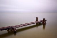 Rustige lange blootstelling van oude houten voetpijlers die uitsteken in een melkachtige zee met een melkachtige lucht.