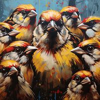 Vogel Kunstwerk - Dit schilderij trekt de aandacht met een troep levendige vogels die vanaf het canvas de ruimte in lijken te kijken. De dynamische combinatie van realistische en abstracte elementen—heldere kleuren tegen een achtergrond met een urban feel—geeft dit kunstwerk een eigentijdse uitstraling die zowel energie als…