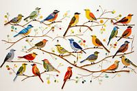 Vogel Kunstwerk - Dit charmante tafereel toont een divers gezelschap van gestileerde vogels, die speels op takken zijn neergestreken tussen zachte blaadjes en bessen. Elk vogeltje heeft een uniek, kleurrijk verenkleed, uitgevoerd in een range van warme en levendige tinten die een gevoel van levendige harmonie uitstralen. Het kunstwerk…