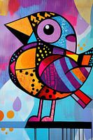 Vogel Met Patroon En Kleuren - Op dit schilderij zie je een kleurrijke vogel met een groot hoofd en verschillende patronen in levendige kleuren, wat het een vrolijke uitstraling geeft en past binnen de moderne kunststijl.