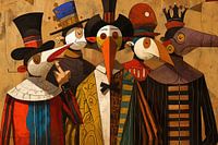 Vogel Schilderij | Eccentric Feathers - Dit surrealistische vogel schilderij toont een groep van vijf vogels gekleed in extravagante menselijke kledij, elk met een unieke en kleurrijke stijl, geportretteerd tegen een achtergrond met aardse tinten.