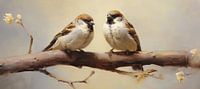 Vogel Schilderij - Dit fijngevoelige tafereel van twee mussen op een tak, gevat in een warme, zachte kleurpalet, ademt een serene, bijna poëtische sfeer uit. De vogels zijn met prachtige details en subtiele schakeringen tot leven gebracht, terwijl de achtergrond en de bloesems een zachte, impressionistische toets geven die rust en…