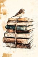 Deze charmante en sfeervolle illustratie toont een kleine vogel die op een stapel oude boeken zit. De warme tinten en zachte aquarelstijl geven het ontwerp een rustieke en nostalgische uitstraling, perfect voor liefhebbers van vintage en natuur. Het gedetailleerde ontwerp is een prachtige aanvulling op iedere ruimte en brengt een gevoel van kalmte en elegantie. Ideaal als decoratie in een kantoor, slaapkamer of woonkamer.